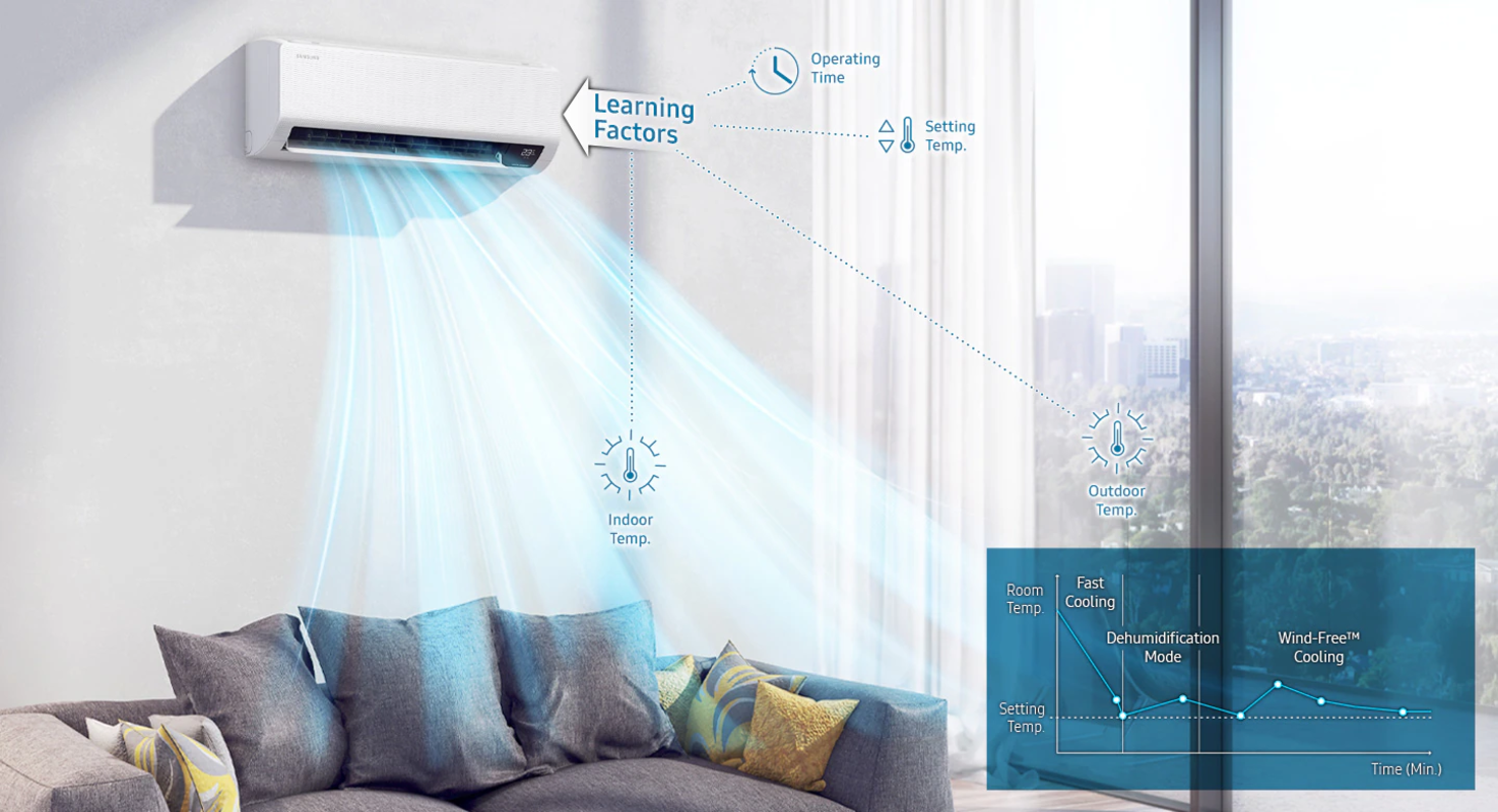 AI Auto Comfort von Samsung nutzt künstliche Intelligenz, um die Klimatisierung in Ihrem Zuhause oder Büro auf höchstem Niveau zu optimieren. Das System analysiert kontinuierlich Raumbedingungen, wie Temperatur und Feuchtigkeit, sowie das individuelle Nutzungsverhalten. Basierend auf diesen Daten stellt AI Auto Comfort die ideale Temperatur automatisch ein, um maximalen Komfort und Energieeffizienz zu gewährleisten. Dank der SmartThings-App können Sie die Einstellungen personalisieren und jederzeit fernsteuern, um die Klimaanlage noch präziser an Ihre Vorlieben anzupassen. Dies führt zu weniger Energieverbrauch und einem stets optimal temperierten Raum.