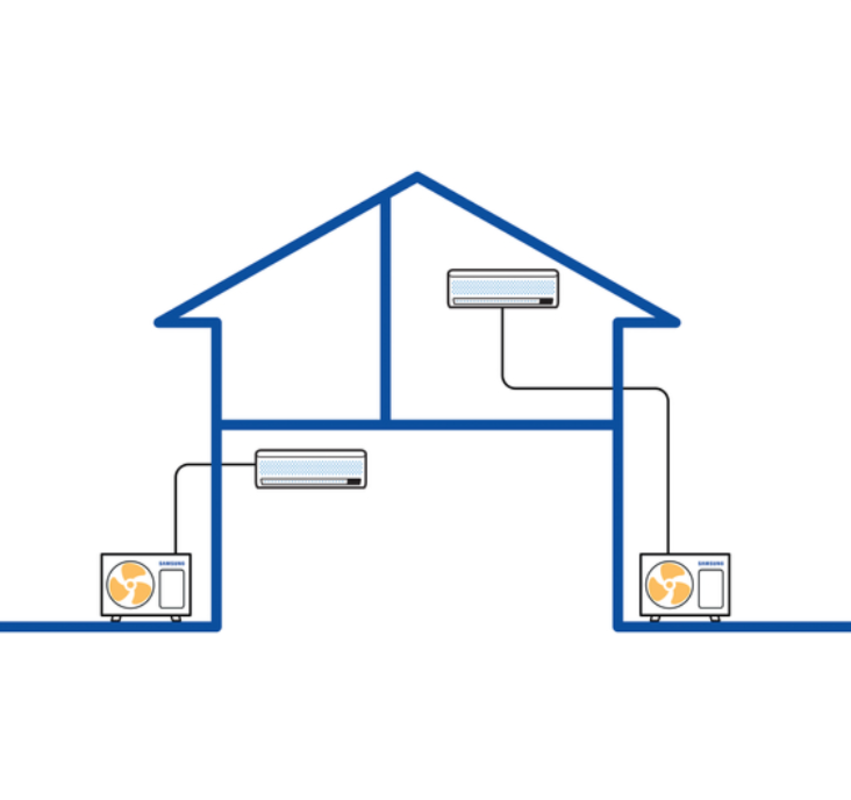 - Direkte Verbindung: Eine Außeneinheit wird direkt mit einer Inneneinheit verbunden, um einzelne Räume oder Zonen gezielt zu klimatisieren.